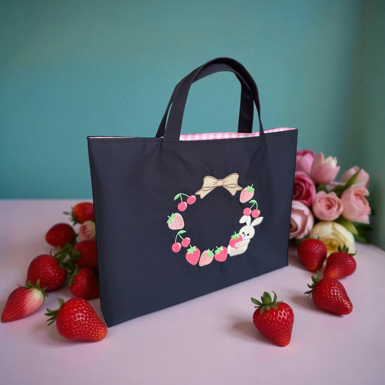 \うさぎとチェリー/レッスンバッグ|リバティ|名入れ|刺繍|女の子|私立|お受験|キルティング|お道具|幼稚園|保育園|小学校|お教室|お稽古|習い事|マチ|私学|入園入学
